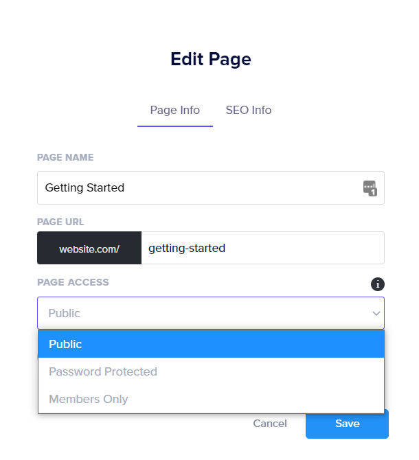 The step settings tab enables you to configure page access levels, page SEO and more.