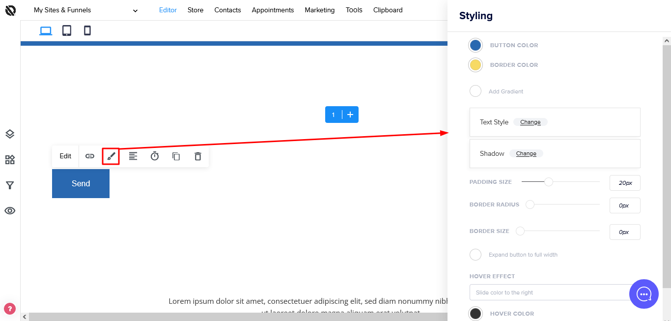 Add or change your font, select the size and radius then add your effects when a visitor hovers over the button.