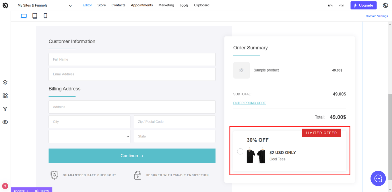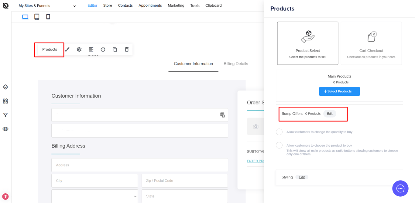 Bump offers help you increase your cart order value. To add a bump offer to your checkout > Select the products tab > then select bump offers as shown below.