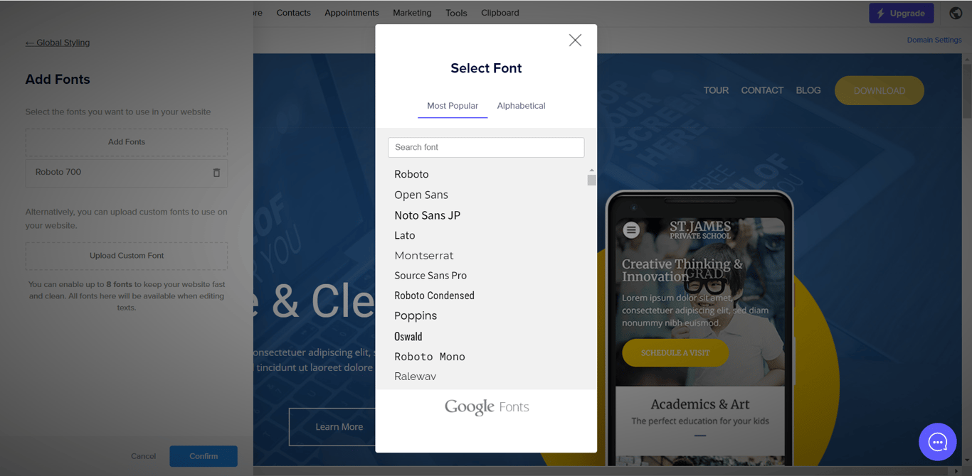 Selecting adding a new font will open the Google font list with over 1000 font types to choose from. The system allows you to have up to 8 font types at any one time.