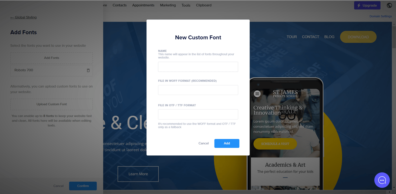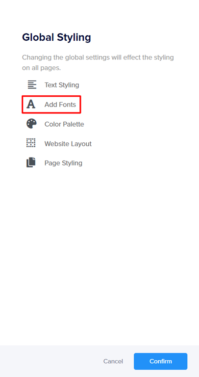 Go to the Global styling tab and select Add Fonts
