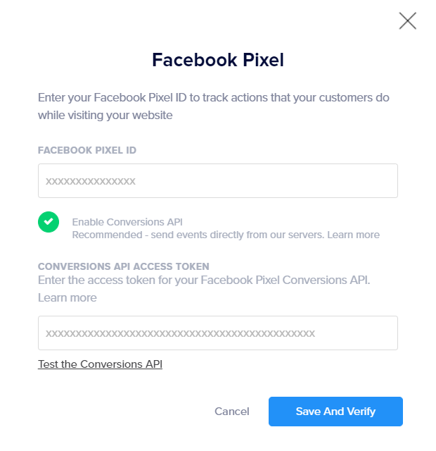 You will be prompted to enter an Access Token to use with the API. To obtain one, visit your Facebook Pixel, go to Settings and scroll down to the Conversions API area.