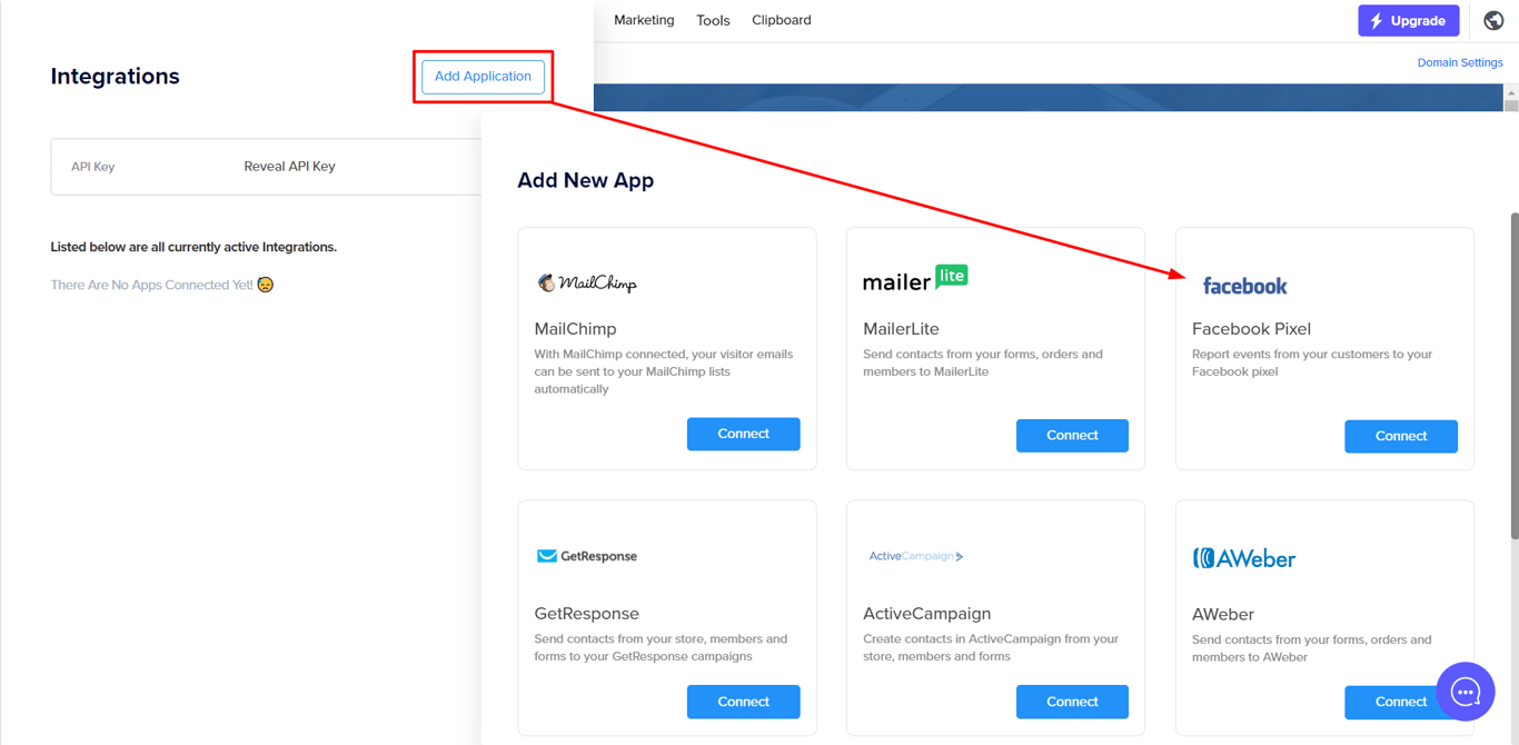 Go to Dashboard > Applications and enter your Pixel ID in the Facebook application: